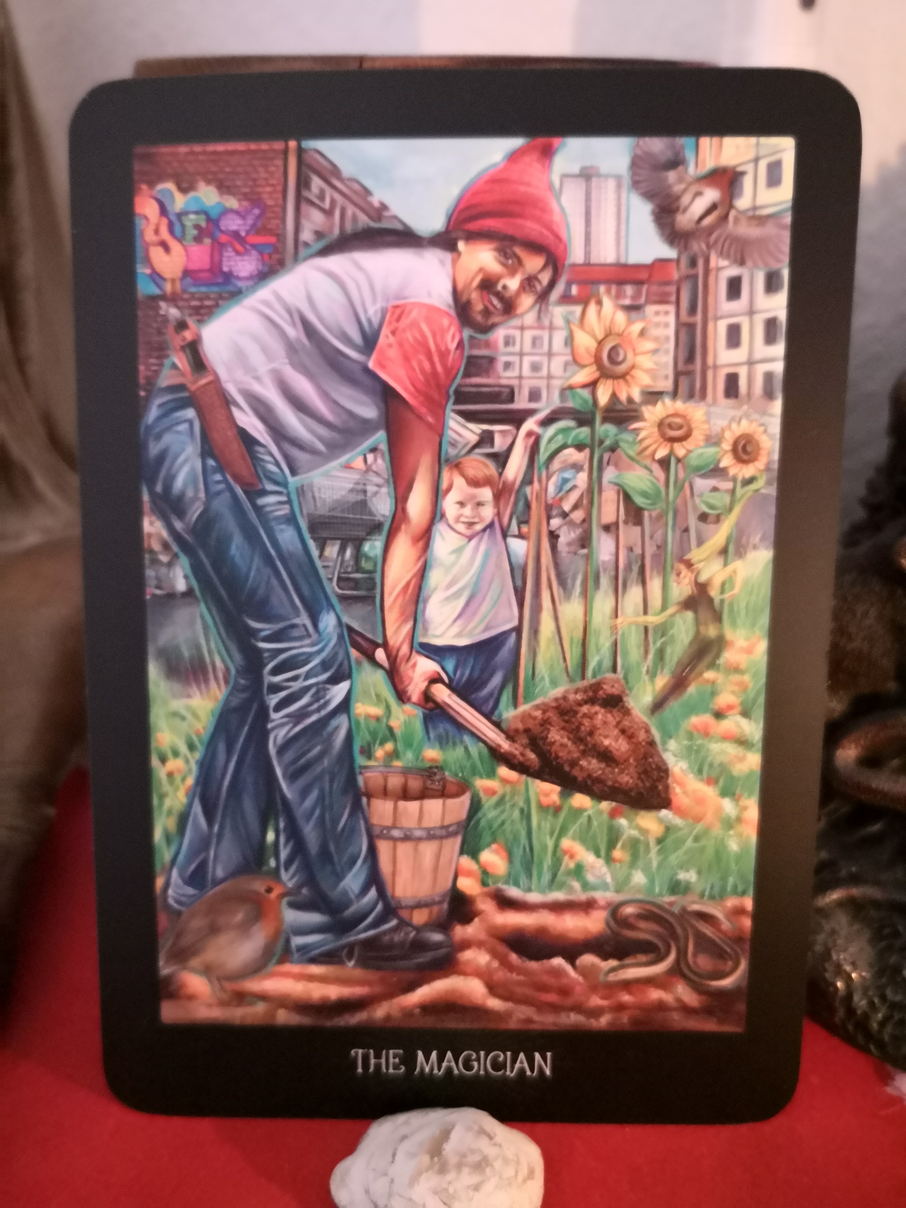 Der Gärtner (Magier) trägt ein Messer am Bund (Schwert), der Spaten seht für die Stäbe, der Eimner (Kelche) enthält das Wasser und die Sonnenblumen übernehmen die Symbolkraft der Pentakel (aus dem Samen entstehen wunderbare Gewächse). Seine rote, spitze Kappe meistert die Verbindung zum Höheren während das Naturgeisterwesen die Verbindung zur Spirit-World andeutet.