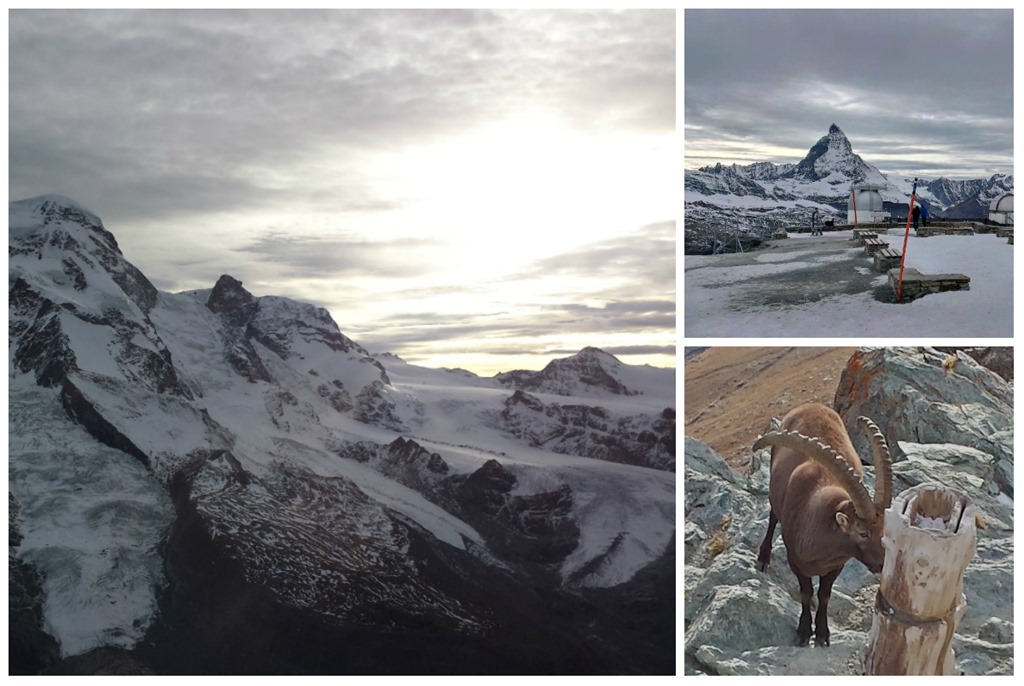 Unser Ziel war aber sowieso der Görnergrat von dem aus man eine tolle Aussicht auf die Berge und Gletscher, und eben auf das Matterhorn hat, welches sich mächtig über den Rest der Gipfel erhebt. Und wir hatten Glück, denn es ist nicht gerade Hochsaison und so waren auch nicht so viele Leute unterwegs und man konnte sich schön Zeit nehmen und war temporär gar öfters alleine, weil sich alle Touristen im Buffet versammelten um Wärme zu tanken.